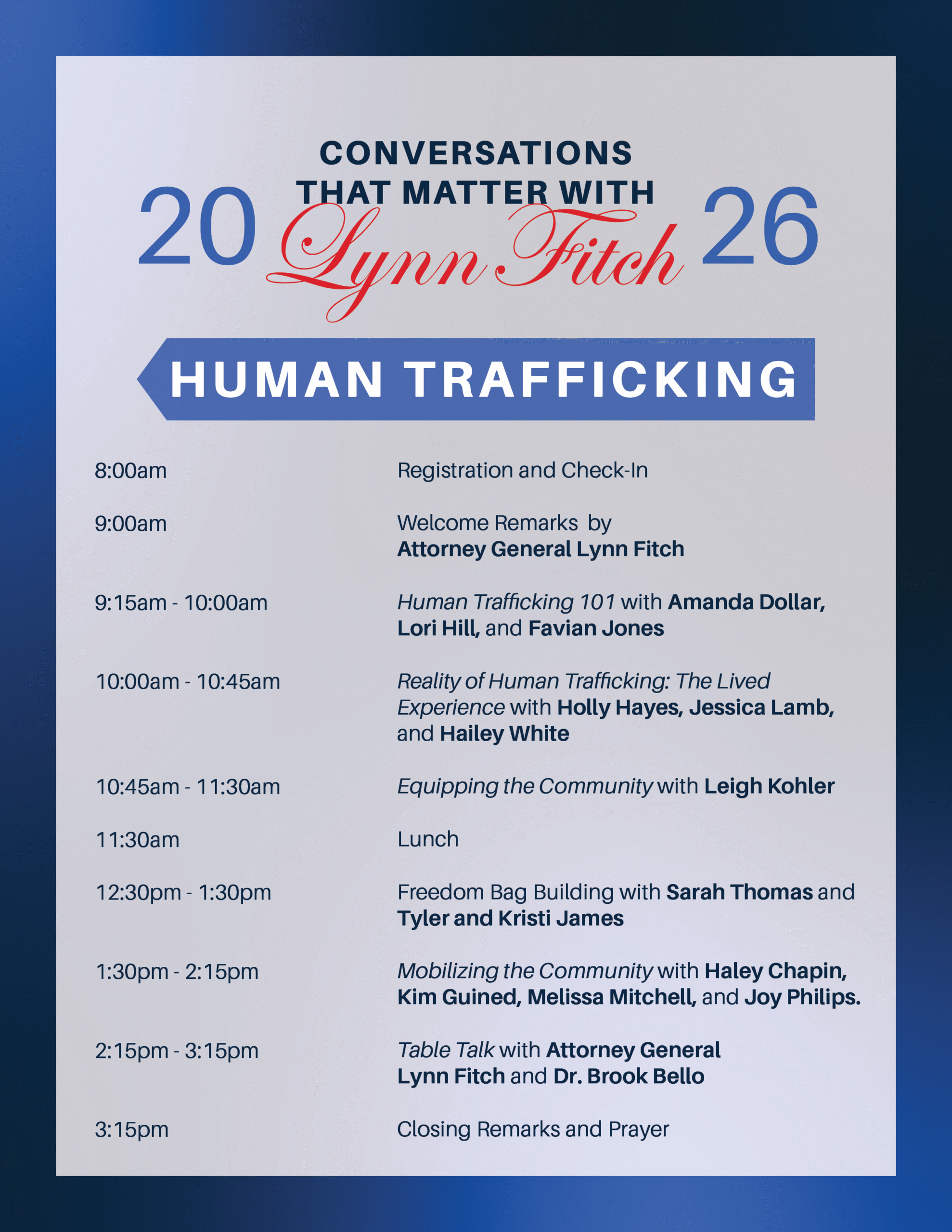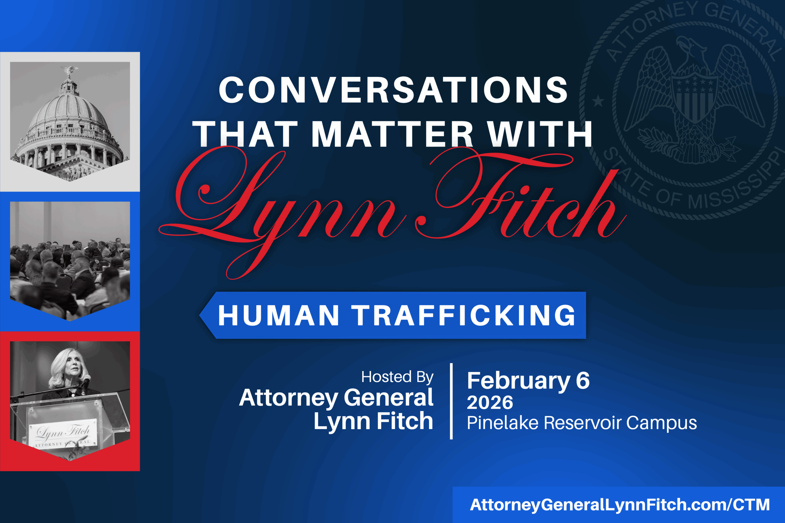 Conversations That Matter is a series from Attorney General Lynn Fitch to engage and empower Mississippians to meet our biggest challenges together. The series will include events that educate and raise awareness, as well as provide meaningful opportunities to offer service in our communities. For more information about the series or about the Human Trafficking Summit, contact Sarah Strozier.